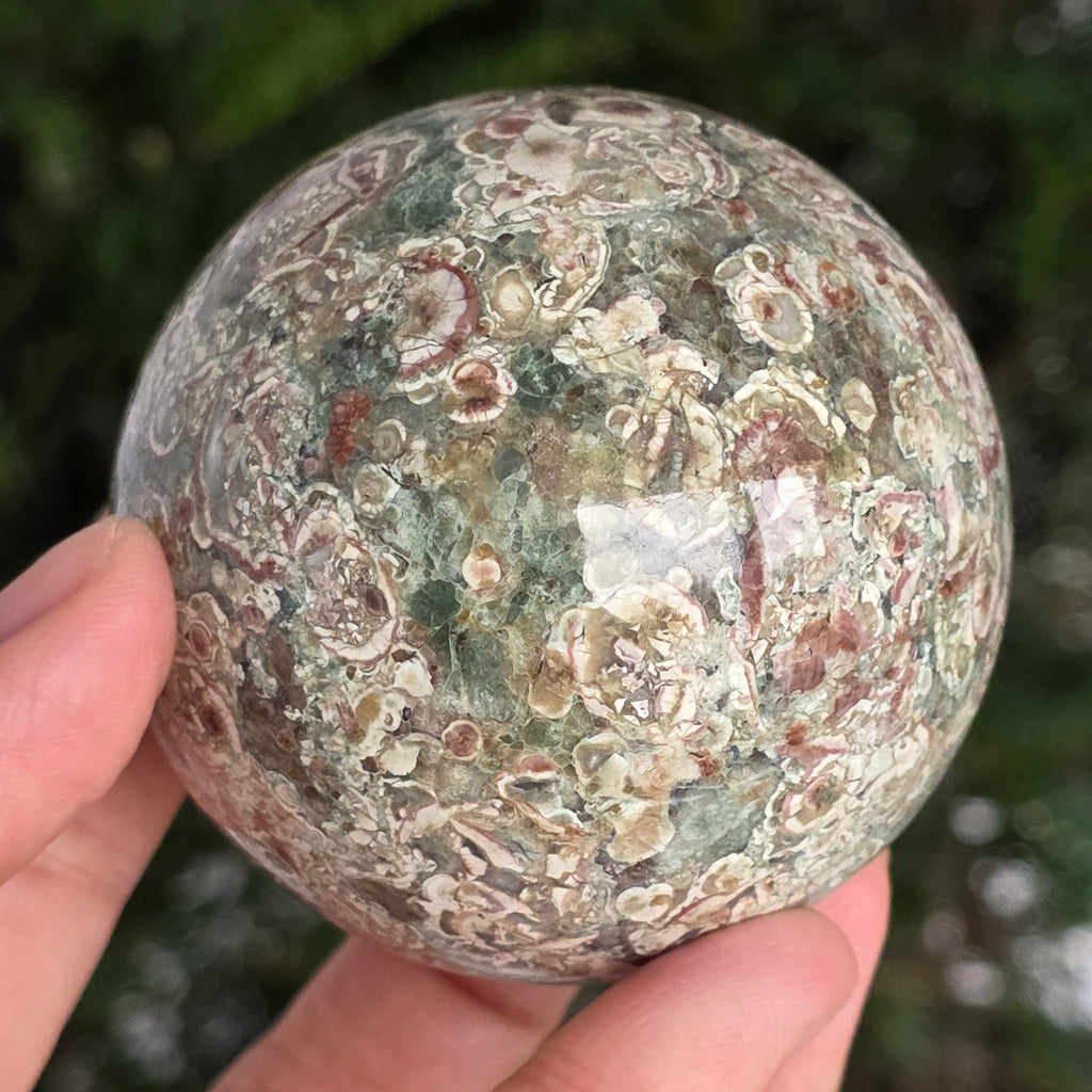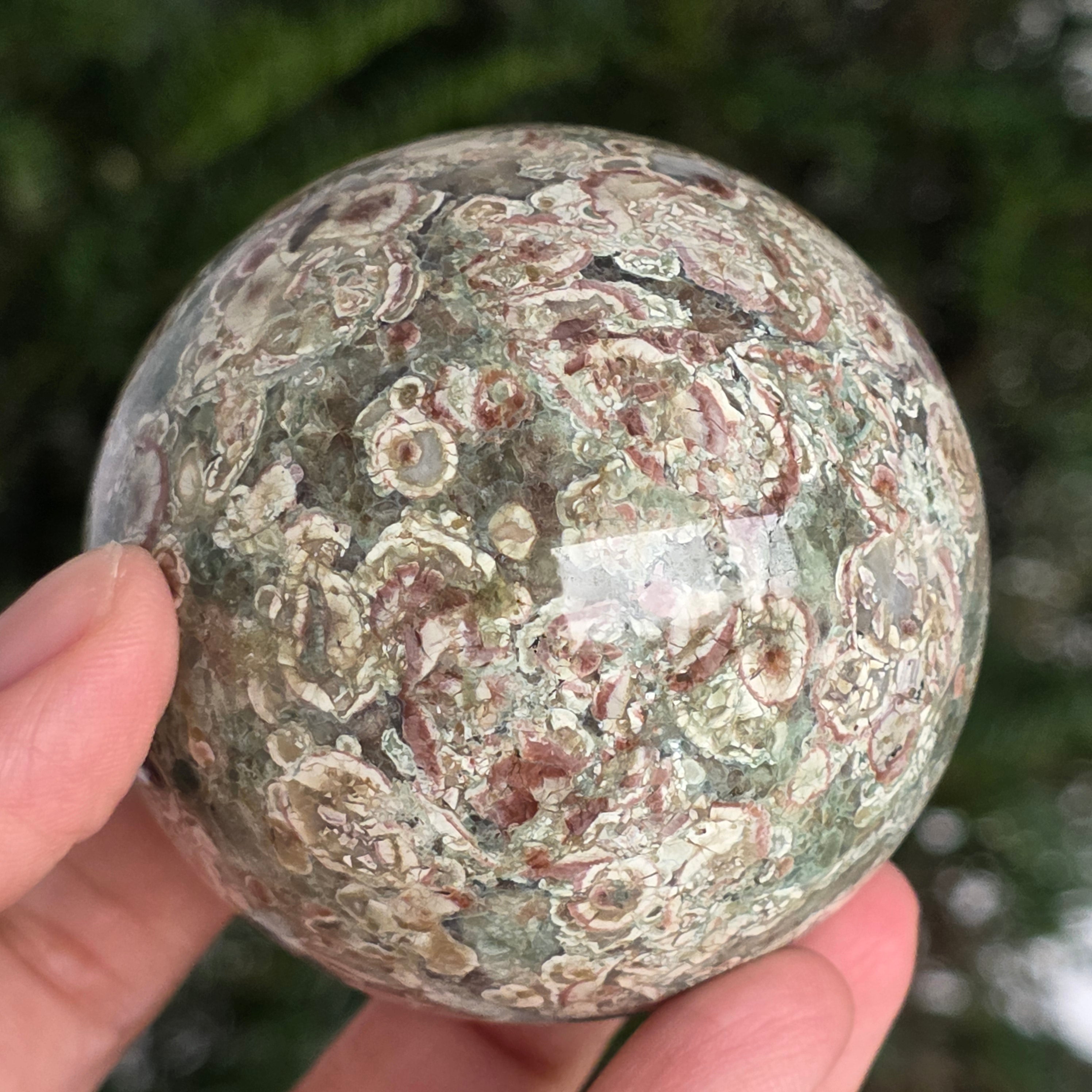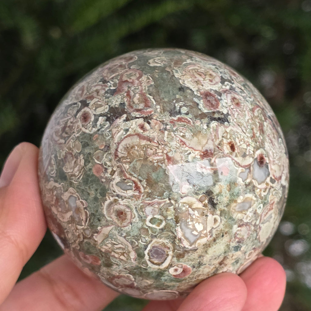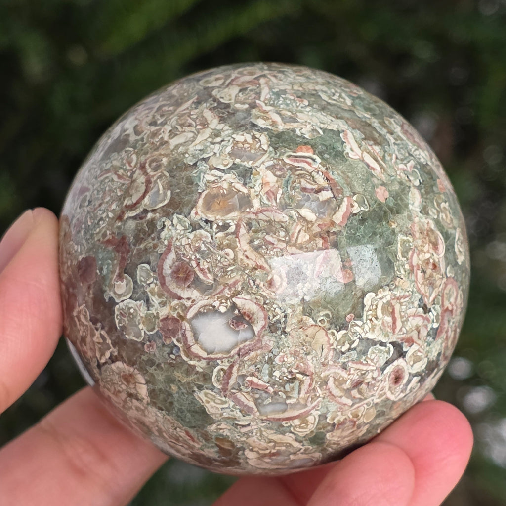 O sferă care poartă în ea urmele unei planete în formare. Texturile vii și culorile pământii ale riolitului natural – nuanțe de verde mușchi, bej, brun și gri vulcanic – se împletesc într-un dans hipnotic de forme și linii, ca o hartă minerală a lumii interioare.