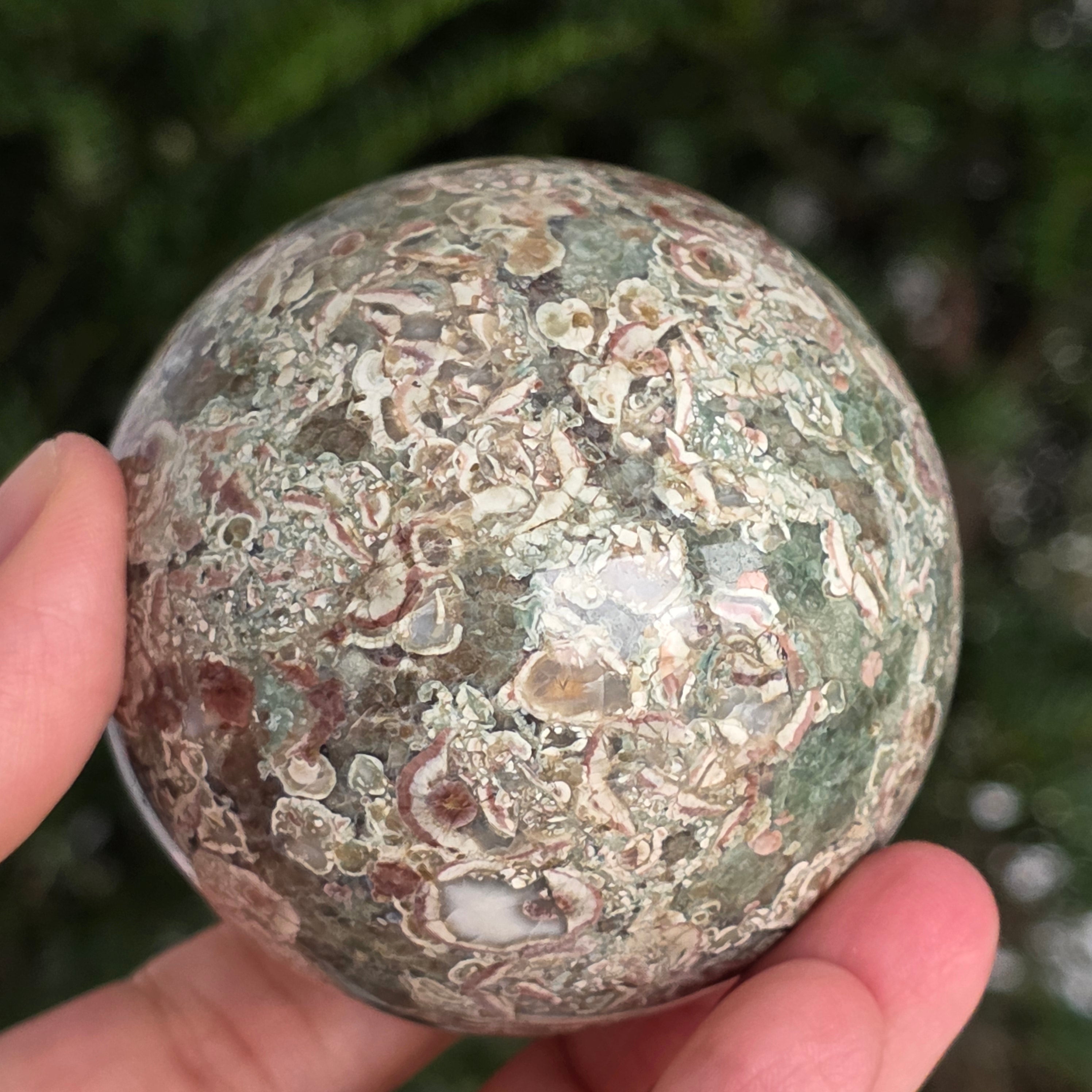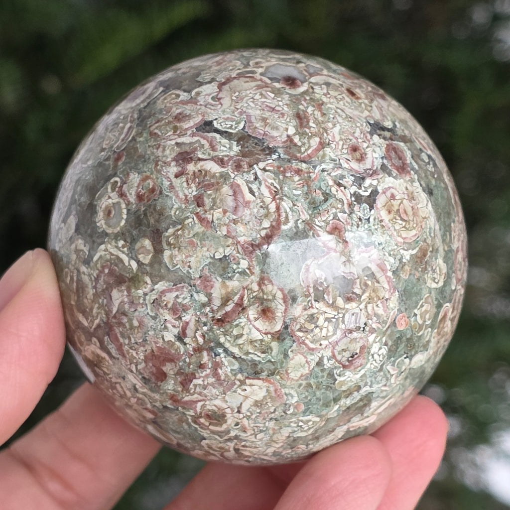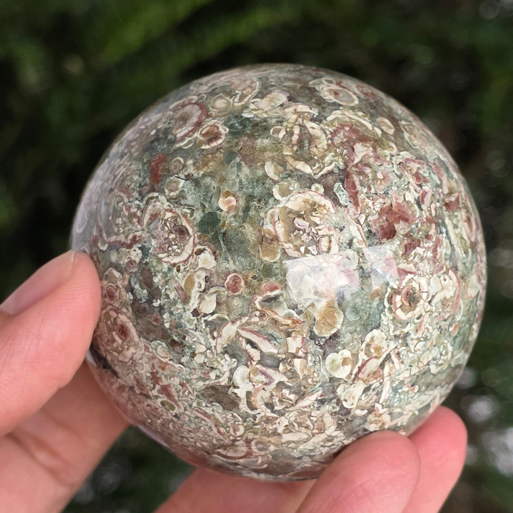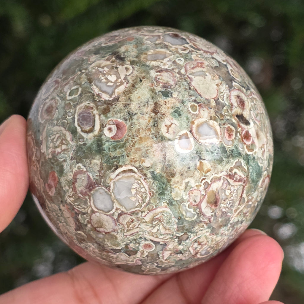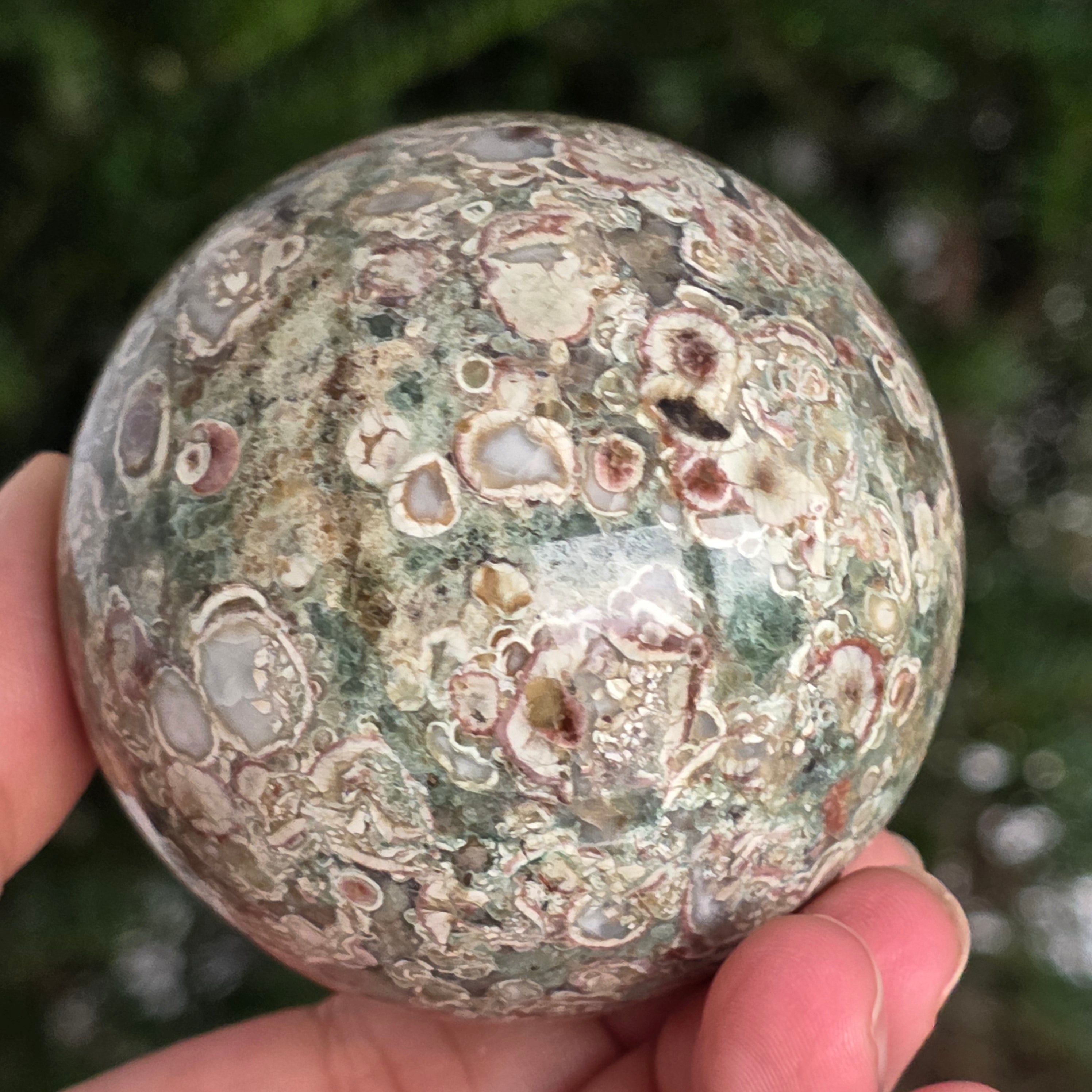 O sferă care poartă în ea urmele unei planete în formare. Texturile vii și culorile pământii ale riolitului natural – nuanțe de verde mușchi, bej, brun și gri vulcanic – se împletesc într-un dans hipnotic de forme și linii, ca o hartă minerală a lumii interioare.