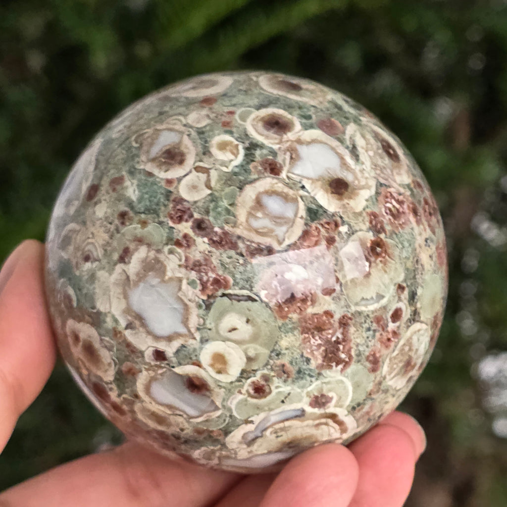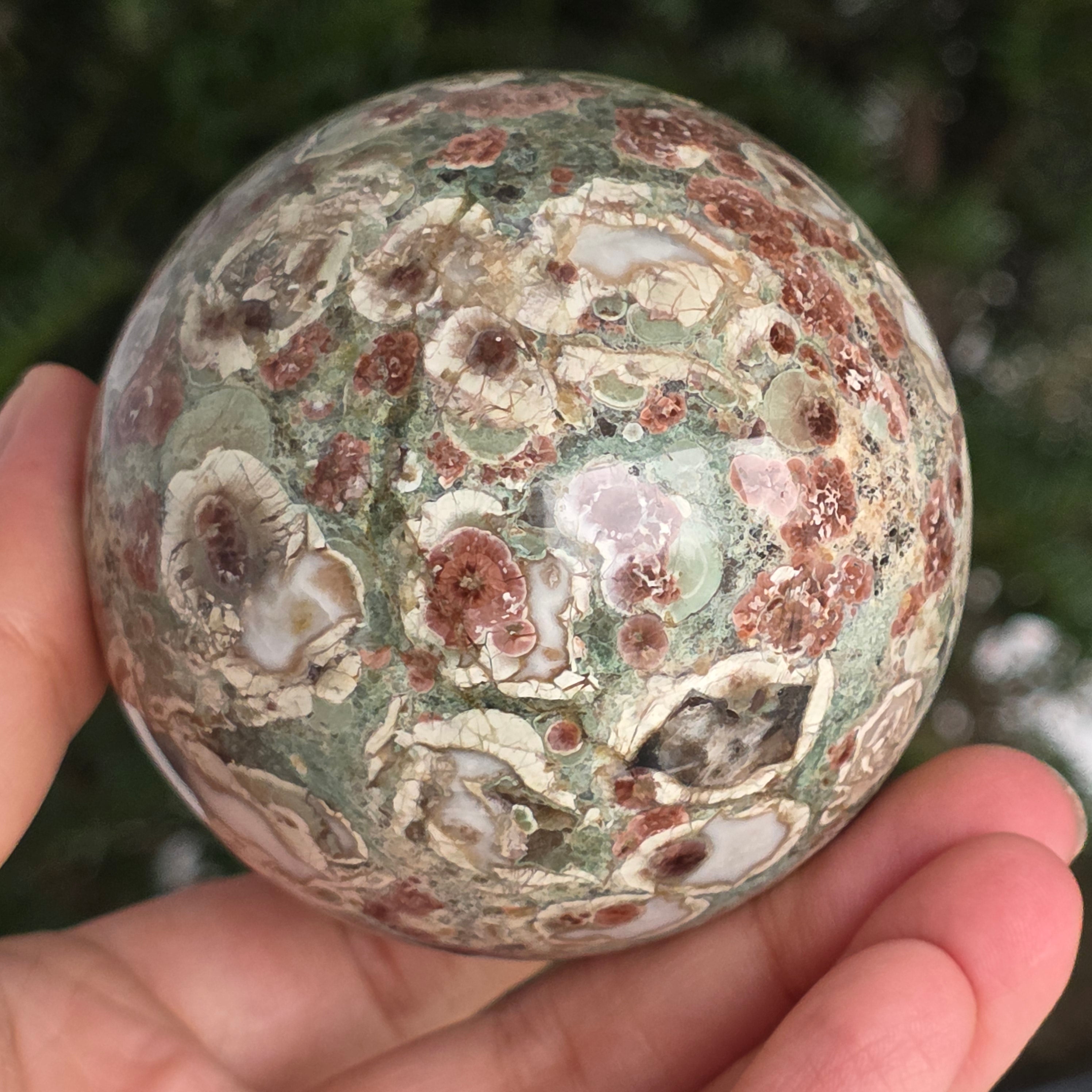 O sferă care poartă în ea urmele unei planete în formare. Texturile vii și culorile pământii ale riolitului natural – nuanțe de verde mușchi, bej, brun și gri vulcanic – se împletesc într-un dans hipnotic de forme și linii, ca o hartă minerală a lumii interioare.