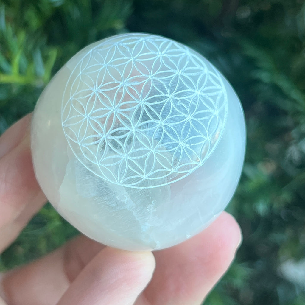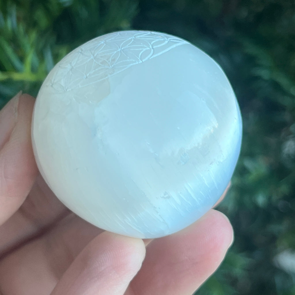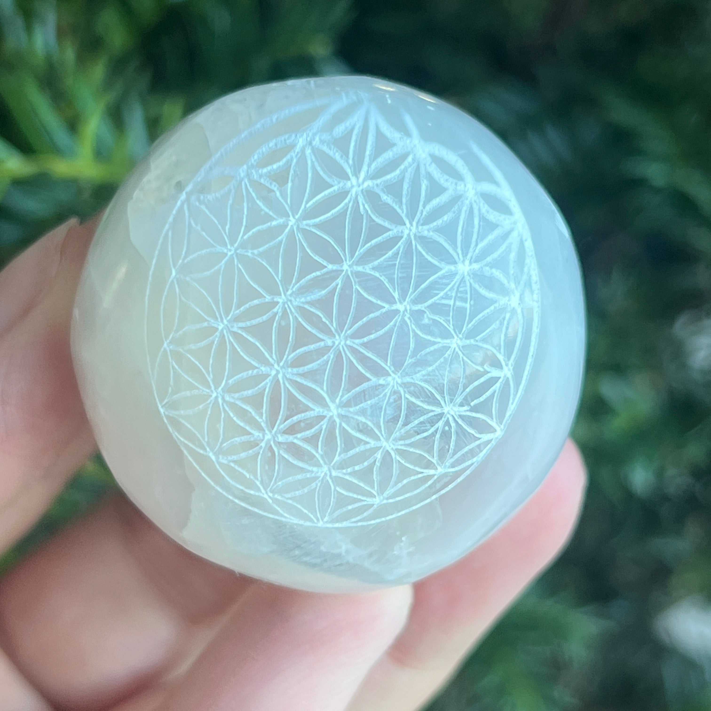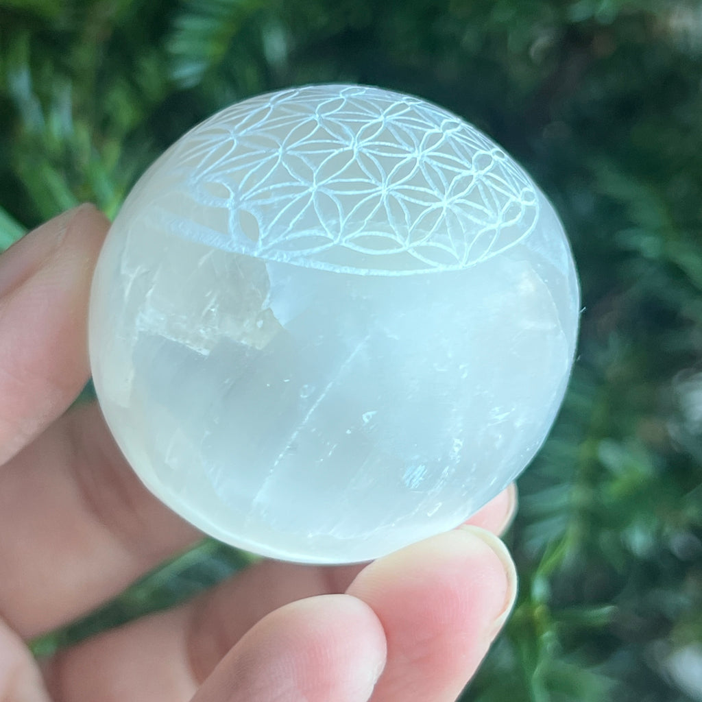 Sfera din Selenit natural gravată cu Floarea Vieții / Flower of Life emană o energie blândă, luminoasă și purificatoare. Forma sferică simbolizează totalitatea, unitatea și echilibrul universal, în timp ce gravura sacrală a Floarea Vieții / Flower of Life amplifică această armonie prin geometria perfectă a creației.