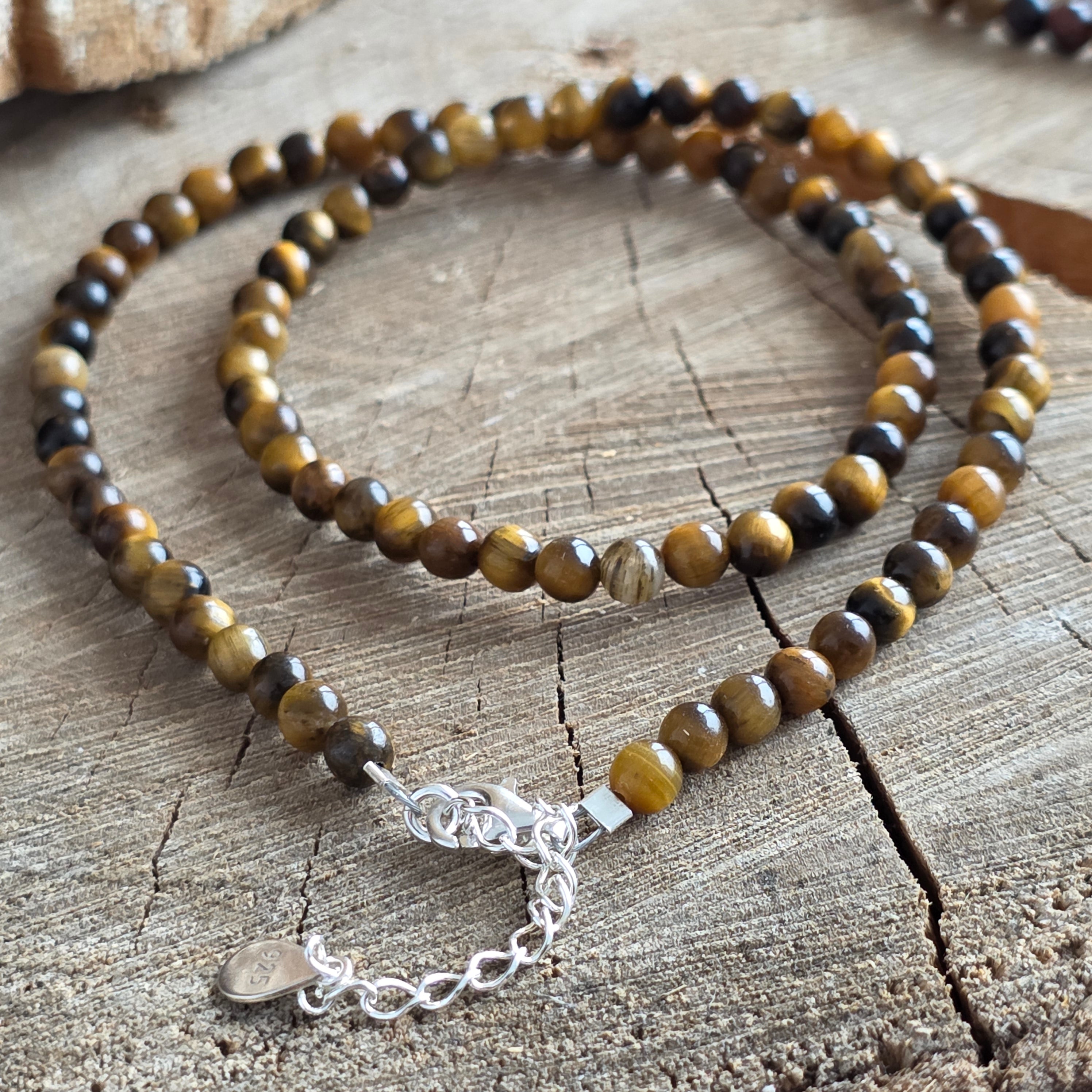 Ένα κόσμημα που δονείται σε χρυσαφένιους τόνους και χάλκινες αποχρώσεις – σαν τις ακτίνες φωτός που διεισδύουν μέσα από το πυκνό φύλλωμα ενός ιερού δάσους. Αυτό το κολιέ από Μάτι της Τίγρης, με χάντρες 4 χιλιοστών, αποκαλύπτει μια λεπτή λάμψη, σαν μια υπόσχεση ψιθυρισμένη από την ίδια τη γη.
