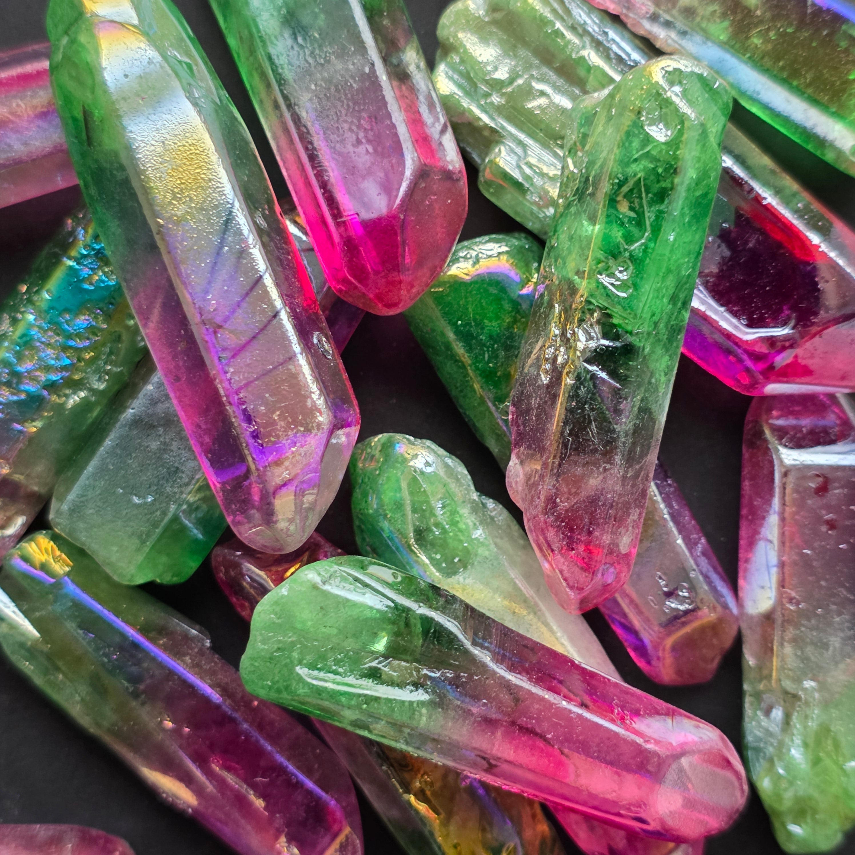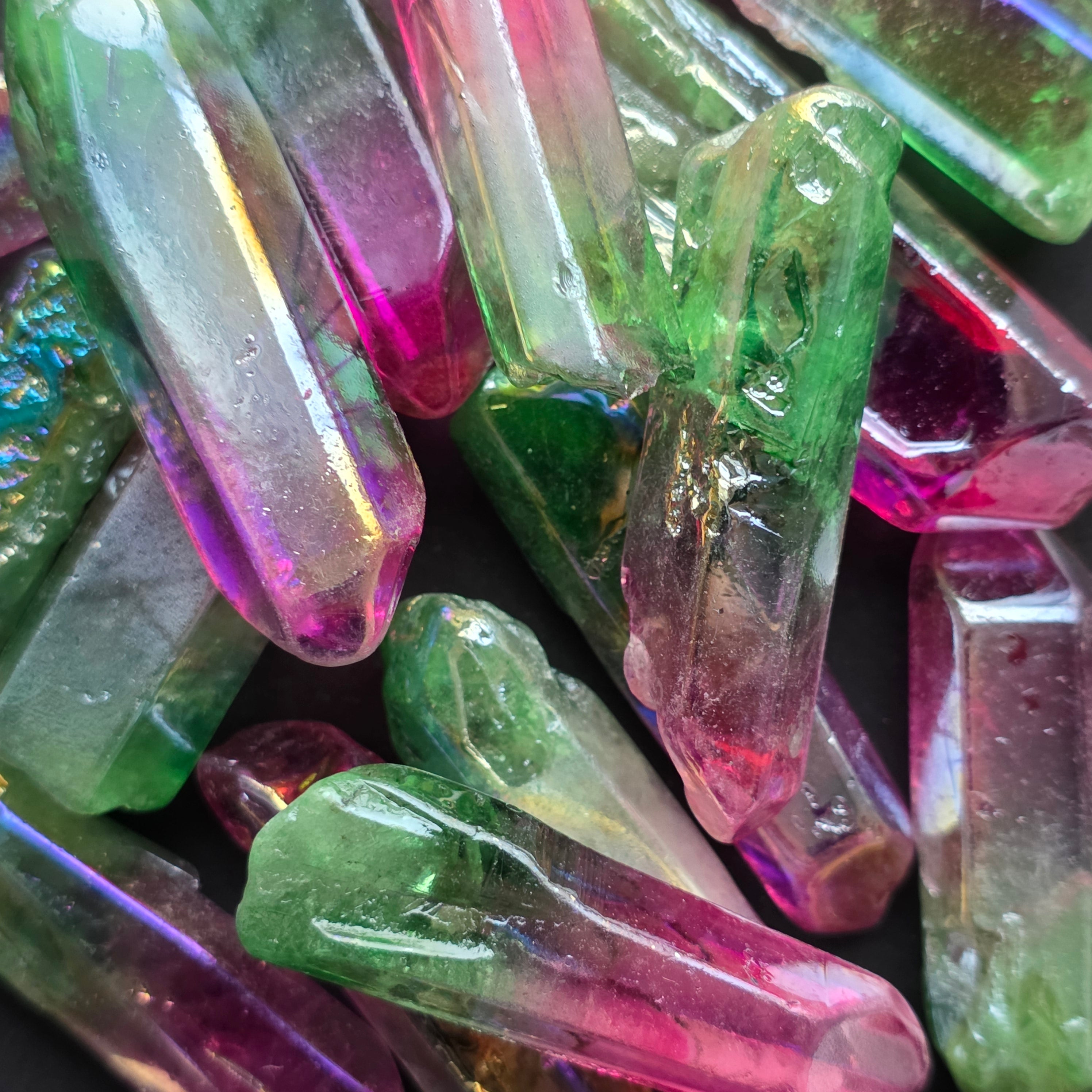 Acest cuarț este colorat, prin procesul cunoscuta ca si aura coating pentru a intensifica reflexele irizate și energia vibrantă a cristalului.